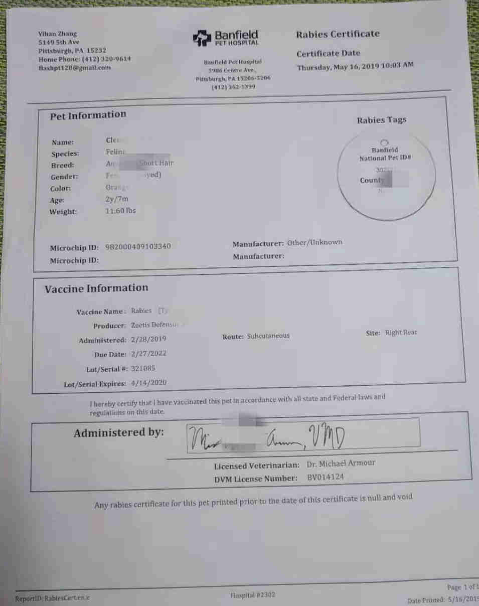 1. Pet information (including breed, scientific name, gender, hair color, date of birth or age);