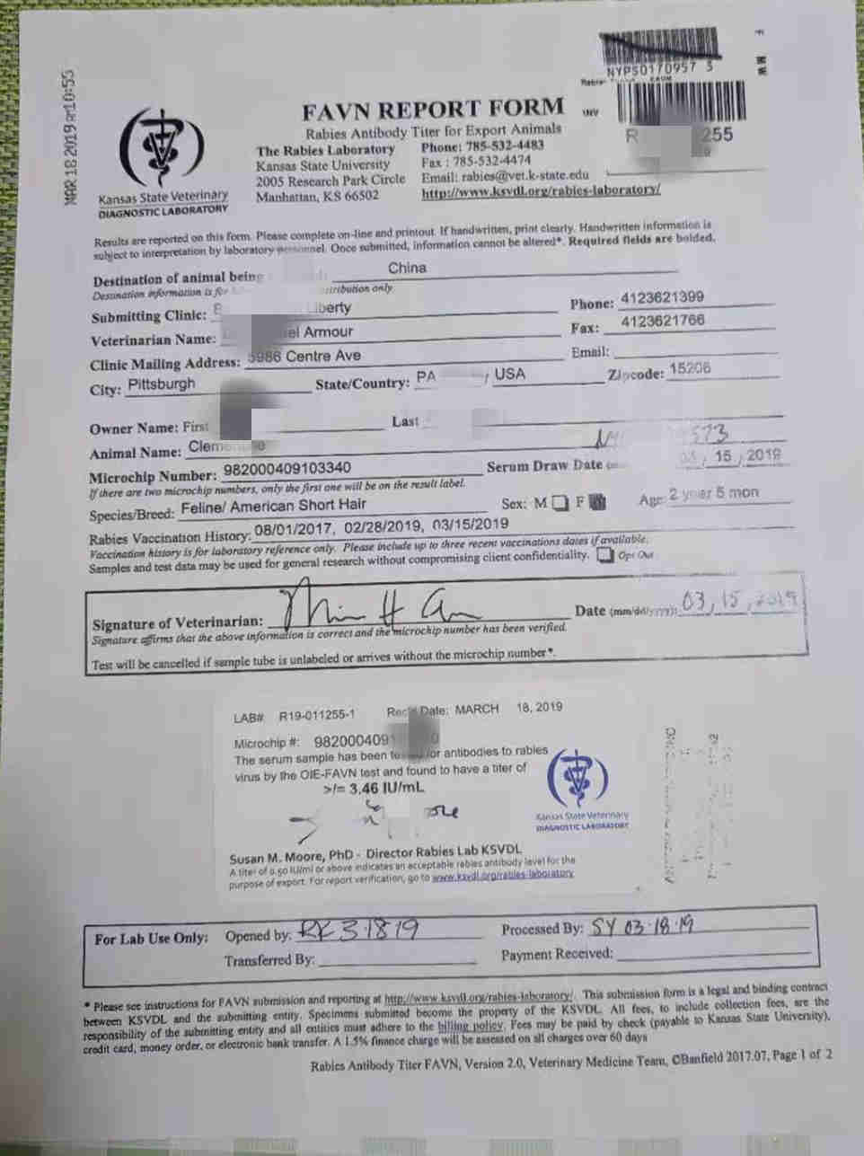 - 對(duì)于無法提供官方檢疫證書或疫苗接種證書的寵物,作退回或銷毀處理。對(duì)于出現(xiàn)無法提供中國(guó)海關(guān)采信檢測(cè)結(jié)果實(shí)驗(yàn)室出具的狂犬病抗體檢測(cè)報(bào)告或未植入芯片情況中的一種或兩種(包括無法提供或提供材料不合格)的寵物,作隔離檢疫30天處理。