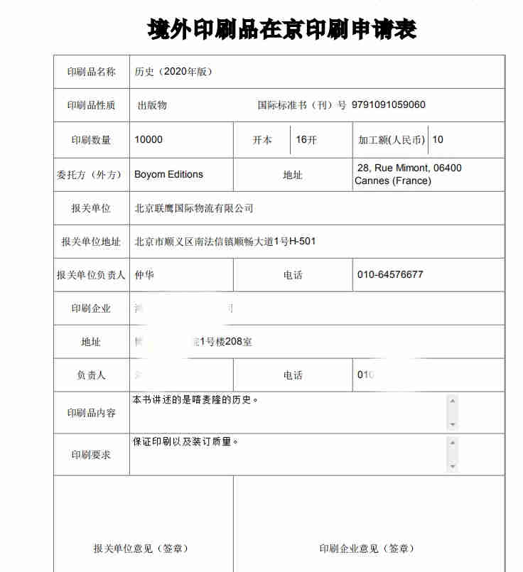 境外印刷品在京印刷申請
