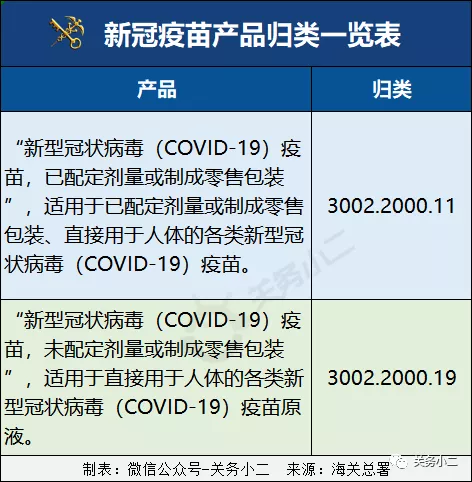 依據(jù)《關(guān)于新冠病毒檢測試劑盒等疫情防控物資申報(bào)相關(guān)事項(xiàng)的公告》(海關(guān)總署公告2020年第138號),目前新冠疫苗產(chǎn)品歸類見下表: