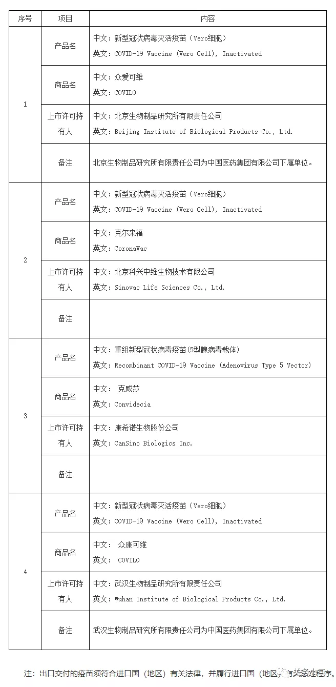 截至2021年6月22日,可供對外出口的新型冠狀病毒疫苗產(chǎn)品清單有:北京生物、北京科興中維、康希諾、武漢生物。后續(xù)將根據(jù)國家藥品監(jiān)督管理局審批上市情況適時(shí)動(dòng)態(tài)調(diào)整。