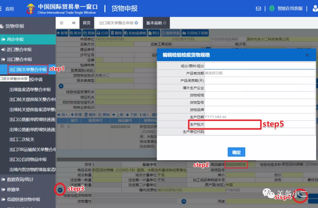 生產(chǎn)批次填報(bào)入口如下圖,填報(bào)入口:【國際貿(mào)易單一窗口】-【貨物申報(bào)】-【報(bào)關(guān)單頁面】-【報(bào)關(guān)單表體報(bào)檢信息欄】-【檢驗(yàn)檢疫貨物規(guī)格】。