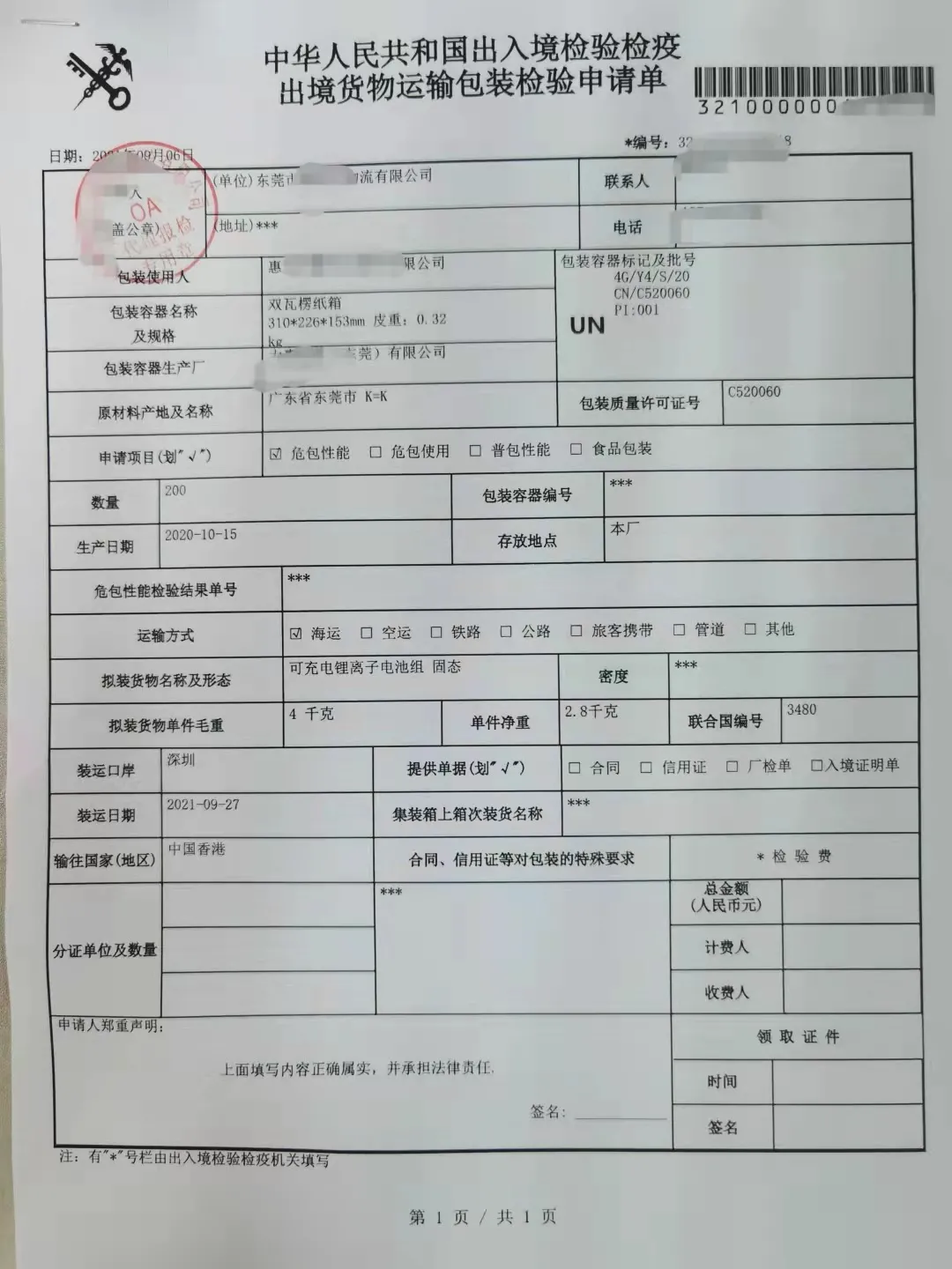 《出境危險貨物包裝使用鑒定結(jié)果單》有效期空運為3個月,其他運輸方式為1年,但都不能超過性能單的有效期。