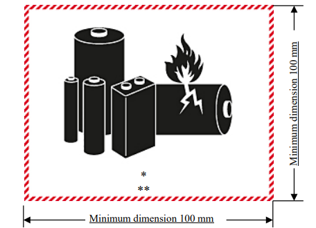 對于符合TDG特殊規(guī)定188條款的鋰電池產(chǎn)品,按上圖所示施加標(biāo)簽,同時標(biāo)明以字母“UN”開頭的聯(lián)合國編號;如包裝中裝有不同聯(lián)合國編號的鋰電池或電池組,應(yīng)用一個或多個標(biāo)簽標(biāo)明所有適用的聯(lián)合國編號。