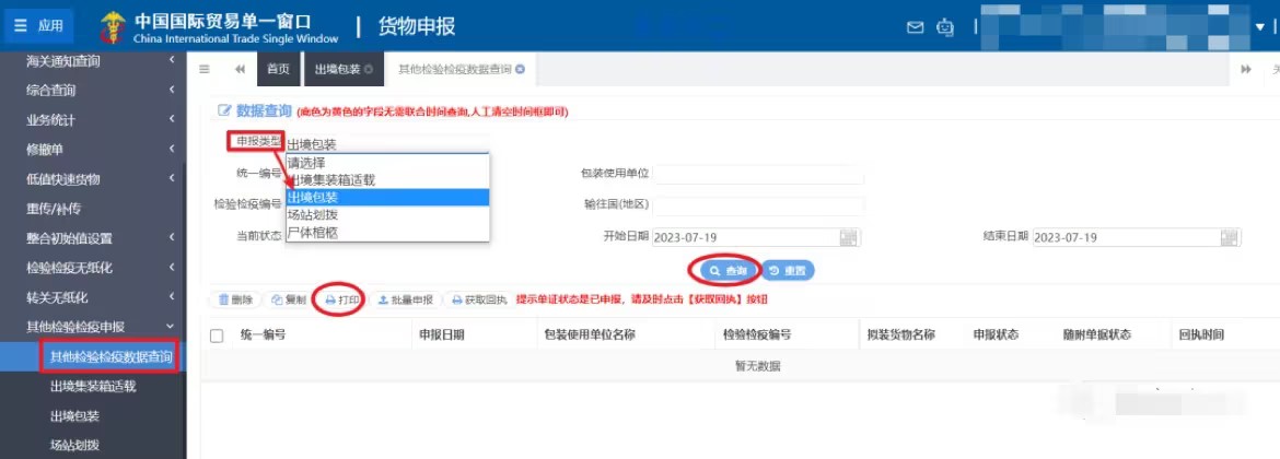 企業(yè)網(wǎng)上報檢成功后,按下圖查詢方法將“出入境貨物包裝檢驗(yàn)申請單”打印出來,并攜帶下方“辦理材料目錄”中的所有資料向所在地海關(guān)申請辦理《出境危險貨物運(yùn)輸包裝使用鑒定結(jié)果單》。